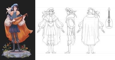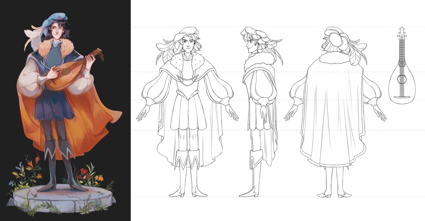 Character design for Felix, self-confident and sarcastic bard whose romance ballads are well-known all over the kingdom.