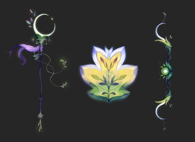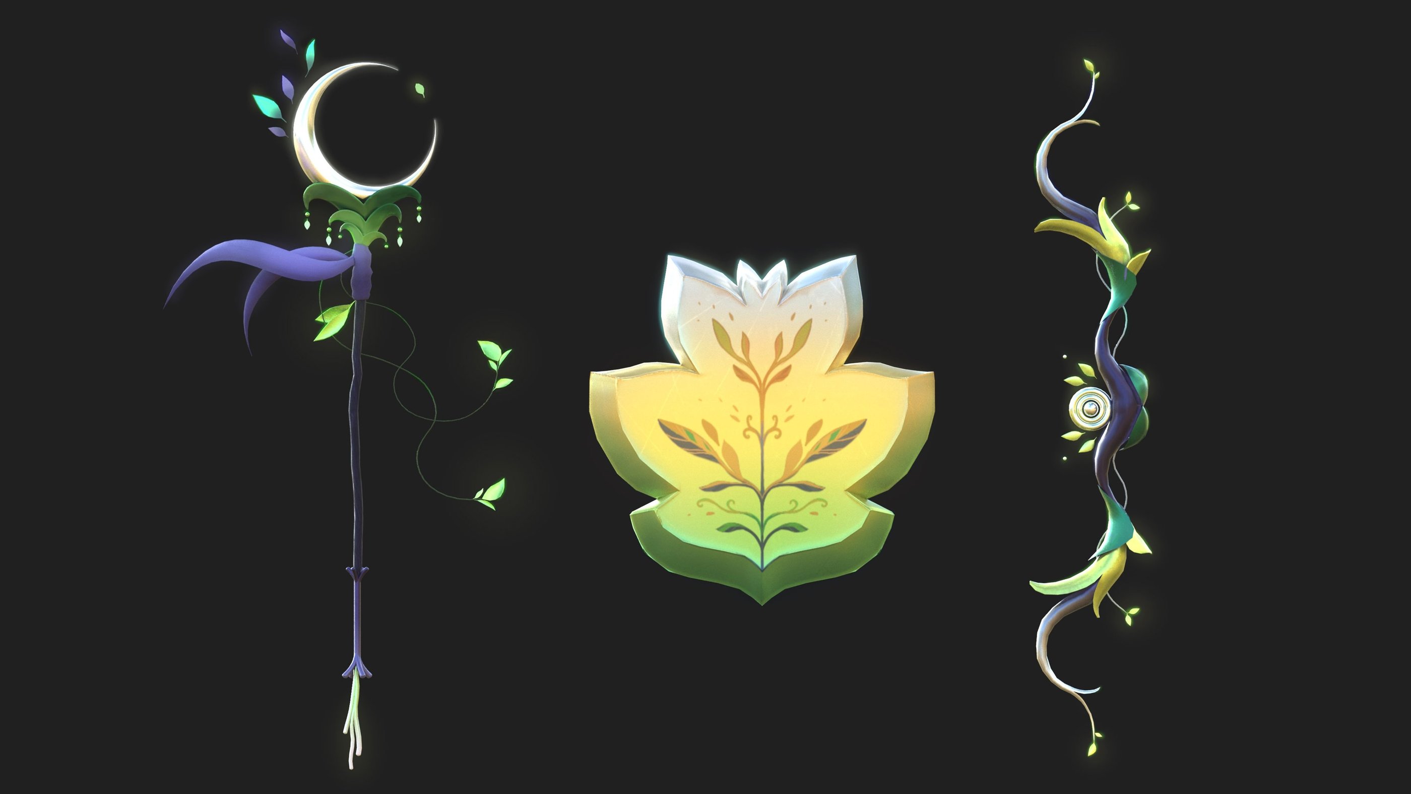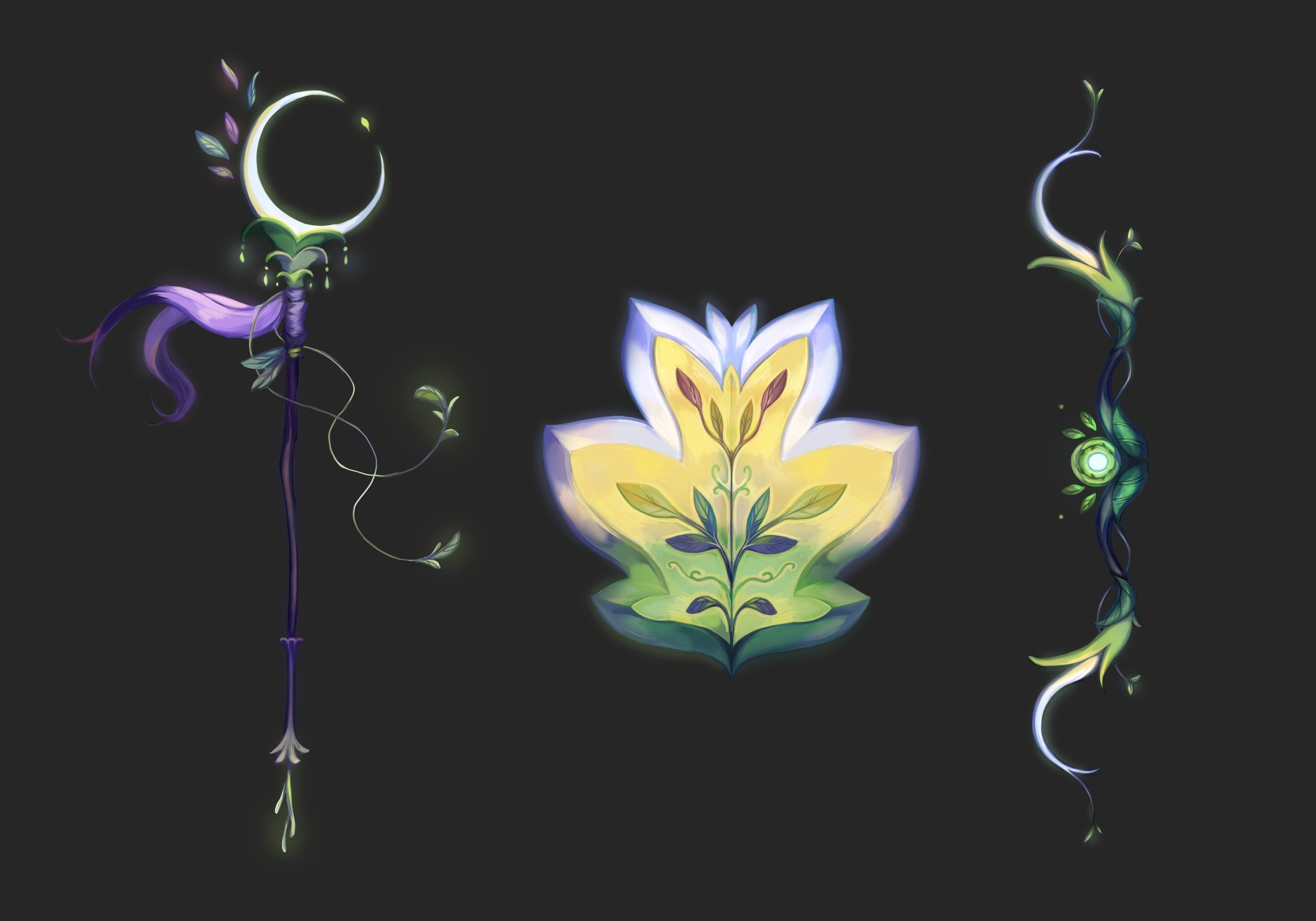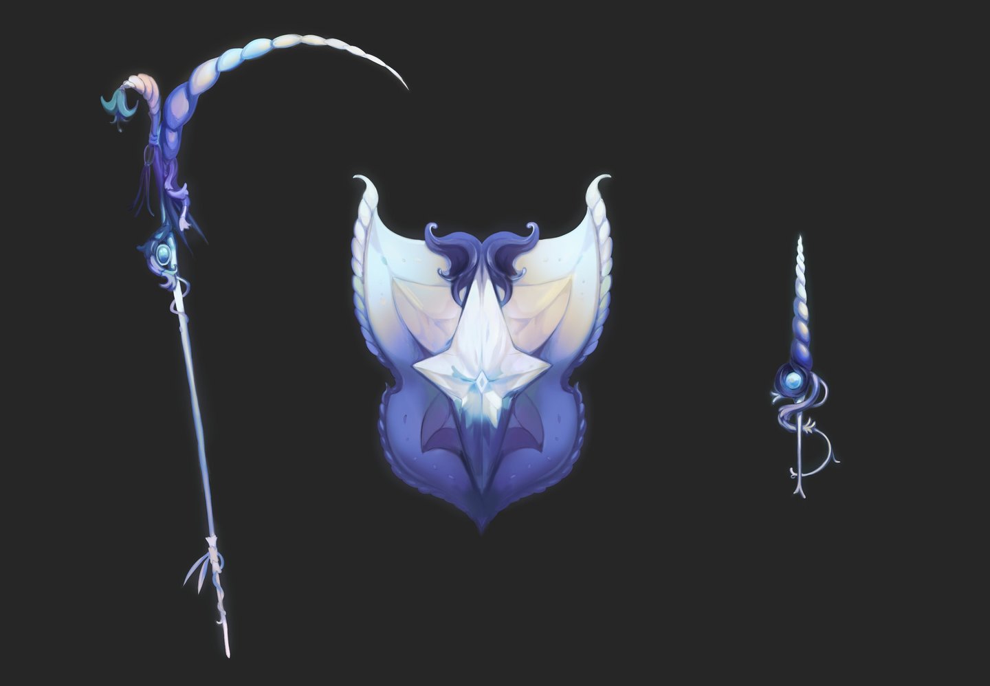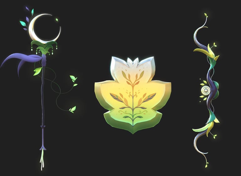 - two fantasy themed weapon sets in their distinctive color palettes, rendered in Photoshop and modeled/textured/rendered in 3D software using the reference.